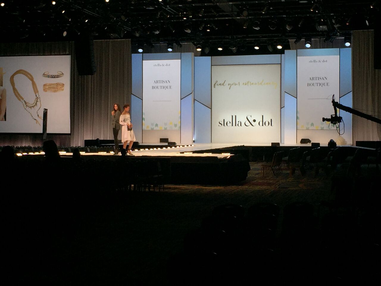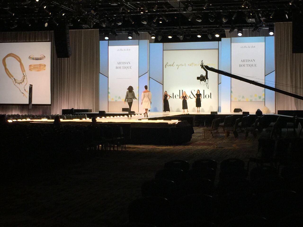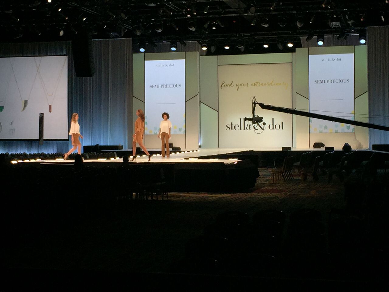 Michelle Morin acted as Production Electrician, and Peter Jones from Webb Production was the Technical Director. The show was produced by Brian Sharp of CMS. The Hoopla is both an opportunity for Stella & Dot stylists to meet and train, but it’s also where a fashion show debuts the upcoming season’s collection. Taking place on a 70-foot runway with a satellite stage, the fashion show is the focus of the opening session. Footage from the fashion show is used for promotional purposes throughout the year. Smooth lighting and a sparkle to the jewelry were critical. A combination of multiple angle lighting and footlighting by Color Force 12 fixtures was used to achieve this goal. Stella & Dot favors a clean look without the use of haze. An elegant set from 3Sixty Scenery provided all the canvas needed to create a variety of looks for the event.